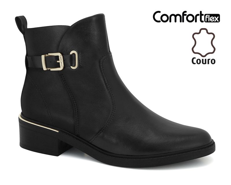Explore a elegância autêntica das nossas botas Comfortflex feitas com cabedais em couro. Cada par é uma fusão de estilo e durabilidade, proporcionando uma experiência única para os amantes de calçados de qualidade. O couro não apenas confere um toque sofisticado, mas também garante resistência e conforto ao longo do tempo. O solado além de flexível possui detalhe metalizado na região do salto, agregando requinte ao visual