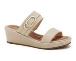 Características: • Palmilha com espuma extra, deixando a pisada bem macia. • Solado leve e levemente emborrachado, com boa aderência ao caminhar. • Tiras largas em material macio de alta qualidade, que abraçam o pé, proporcionando maciez e ótimo calce. • Detalhes metálicos delicados, adicionando charme e elegância ao visual. • Salto anabela de 5,5 cm, que alonga mantendo a estabilidade.