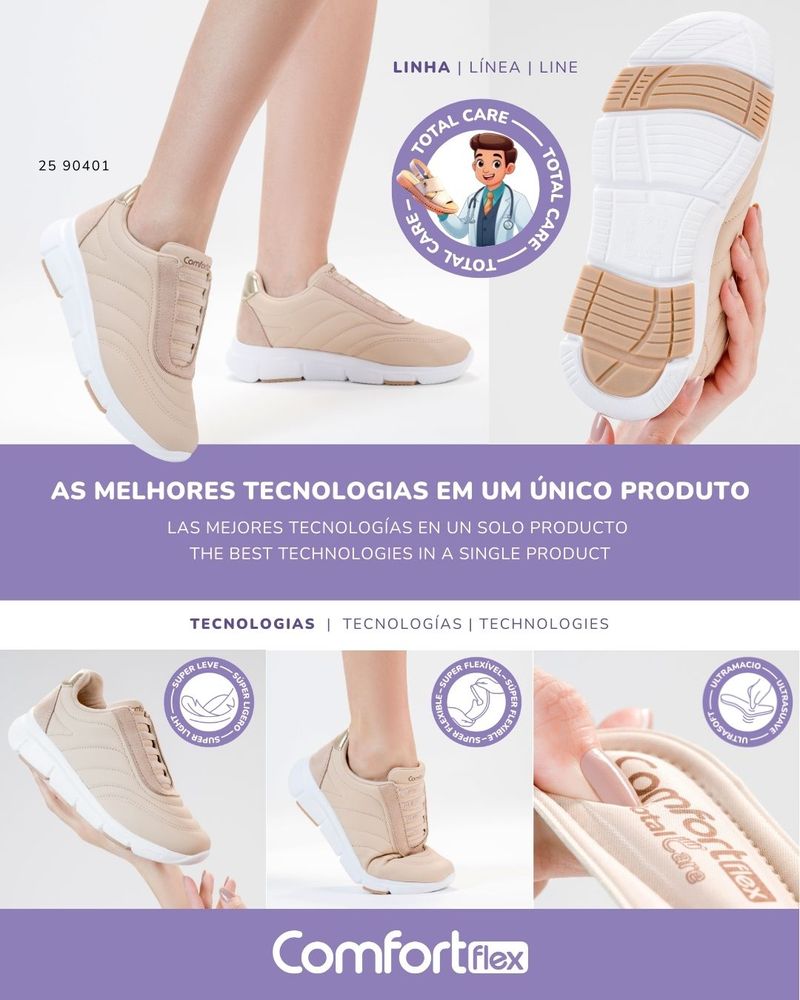 O Tênis Comfortflex Total Care foi desenvolvido para quem busca leveza, conforto e praticidade no dia a dia.